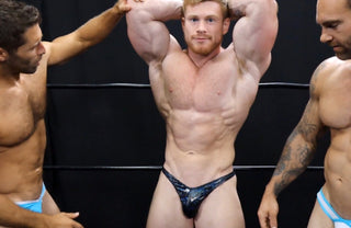 It's that time of year when eerie things are wont to happen, and we're very excited to celebrate our first Beefcake Halloween! A man...or specimen...or mysterious being...appears in the ring, clad in the smallest, sparkliest black bikini he could possibly fit into. He is seemingly unaware of how he (it?) got there. As Blayne and Chace enter, Blayne is immediately rapt, sure that this "beautiful boy," with a physique seemingly chiseled out of marble, is otherworldly; an ancient demigod or an angel,